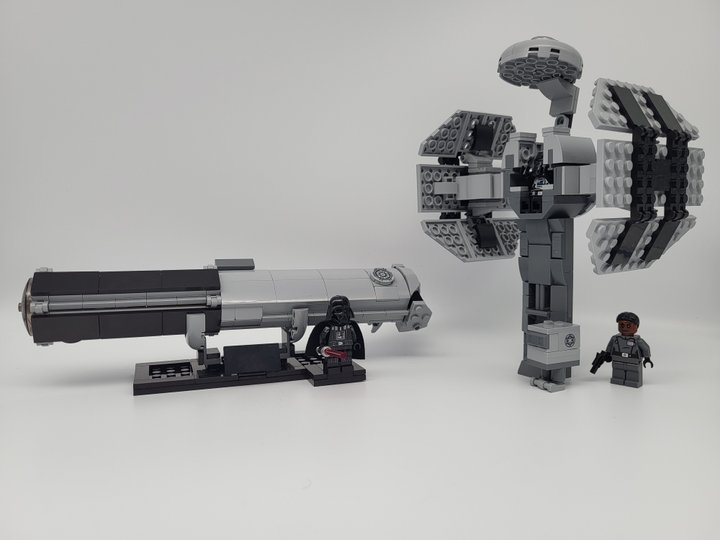 BOTH main builds come with stands, the lightsaber stand supports minifgures and printed tiles