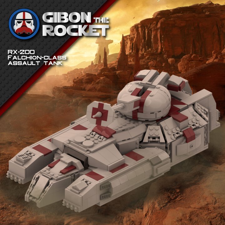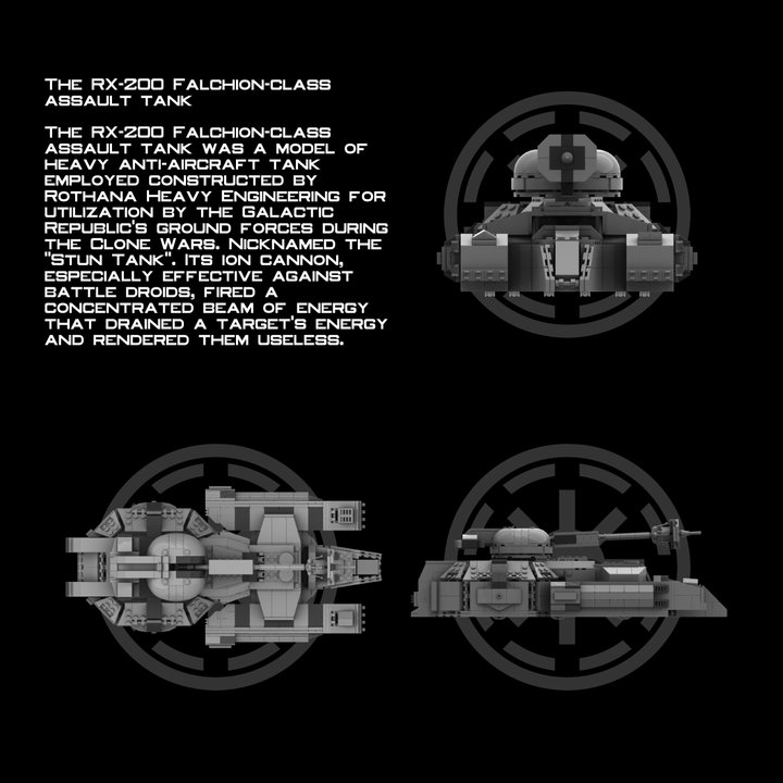 The RX-200 Falchion-class assault tank was a model of heavy anti-aircraft tank employed constructed by Rothana Heavy Engineering for utilization by the Galactic Republic’s ground forces during the Clone Wars. Nicknamed the “Stun Tank” for the effects of its primary weapon, the NNJ-40 “Thunderbolt” long-range ion cannon manufactured by Borstel Galactic Defense, its technological capabilities were considered a variant of the Republic’s Self-Propelled Heavy Artillery Turbolaser. Its ion cannon, especially effective against battle droids, fired a concentrated beam of energy that drained a target’s energy and rendered them useless.