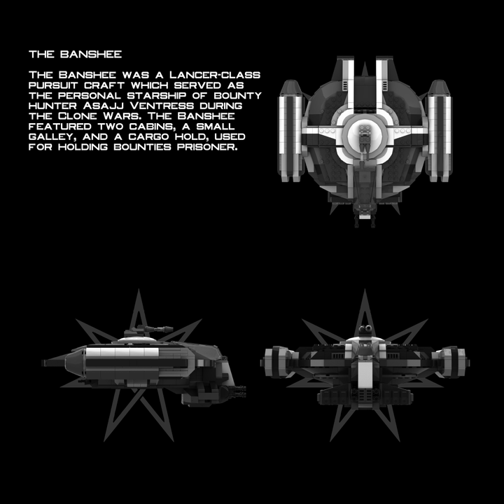 The Banshee was a Lancer-class pursuit craft which served as the personal starship of bounty hunter Asajj Ventress during the Clone Wars. The Banshee featured two cabins, a small galley, and a cargo hold, used for holding bounties prisoner.