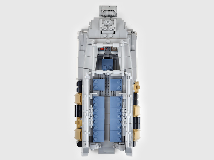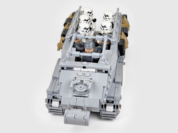An Imperial Armored Personnel Carrier, based on the variant seen in the first episodes of Andor Season 2 on Mina-Rau. This utilitarian troop transport is used for Imperial ground missions that require moving large numbers of personnel and gear across a wide variety of terrains, and also features light armaments on the front to fend of partisan activities.