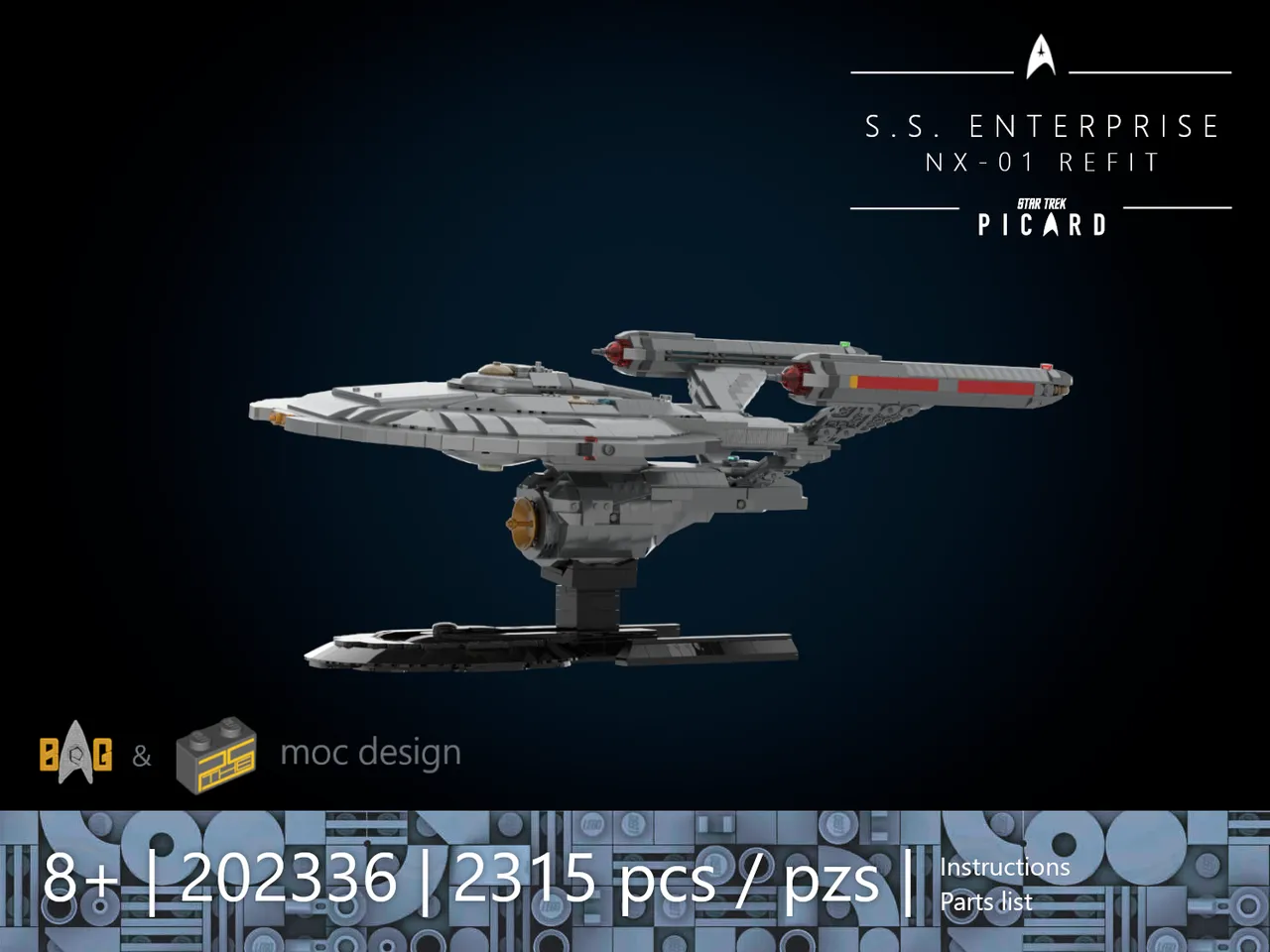 This is a conversion instruction for the BLUEBRIXX 105437 Enterprise NX-01 Display Version. The base model is required. The guide describes the exact conversion process as well as the extension of the secondary hull. All additional parts required are listed in the parts list with their corresponding ID numbers. Since LEGO itself offers very few parts in Flat Silver, the majority of the parts needed for the conversion come from GoBricks (source of supply is listed in the instructions). The 3 deflector pieces (brass-colored) and four secondary hull pieces (Flat Silver) are not available from any brick brand and must therefore be airbrushed or painted.
