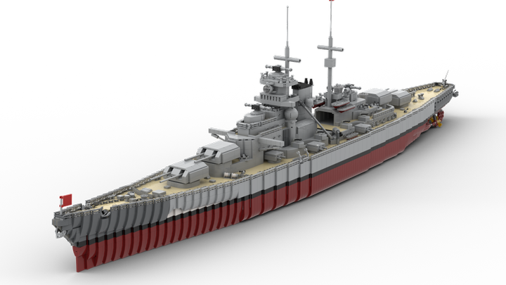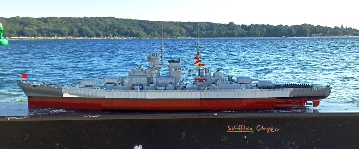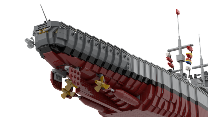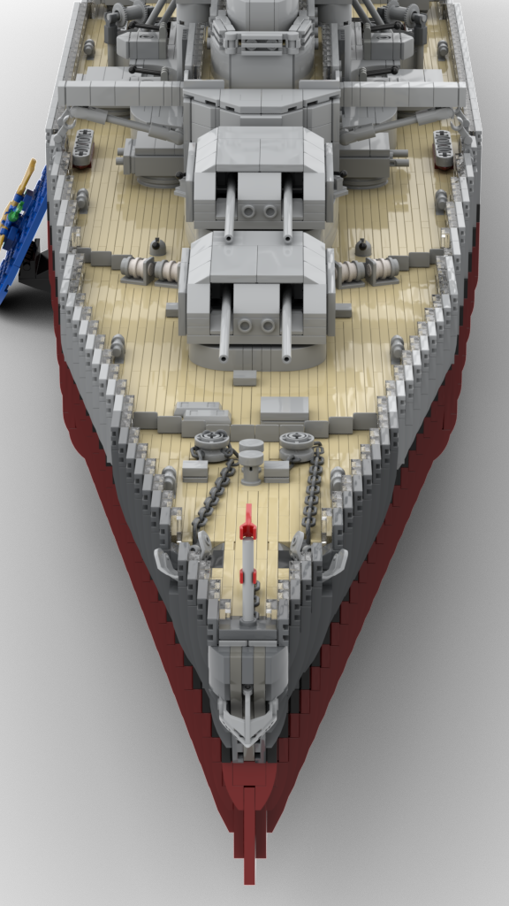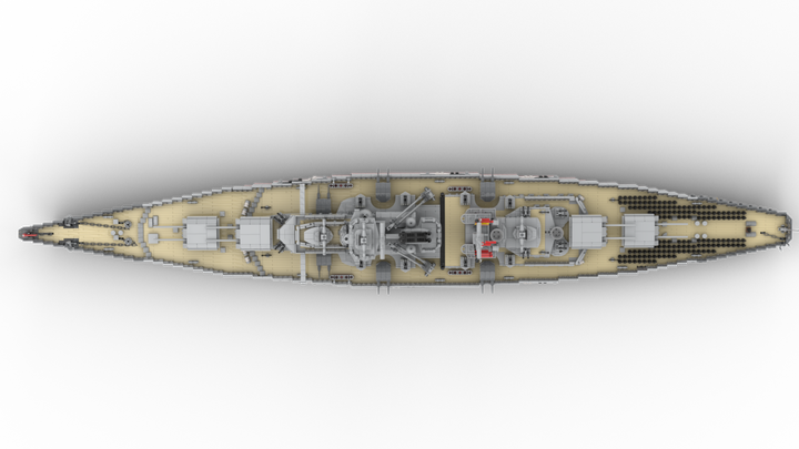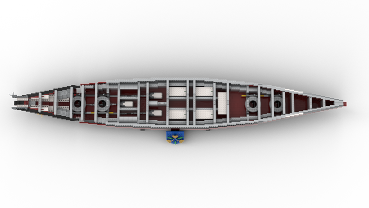 This Model contains more than 9000 parts for those details. You can remove the superstructure in three parts, so you can look in the main deck with a lot of sleepingcabines and toilets. You also can remove the main deck to reach the engines inside the ship. All boiler- and engine-rooms are built with power function components. Furthermore you can control the main turrents.