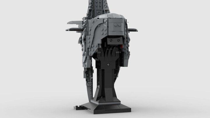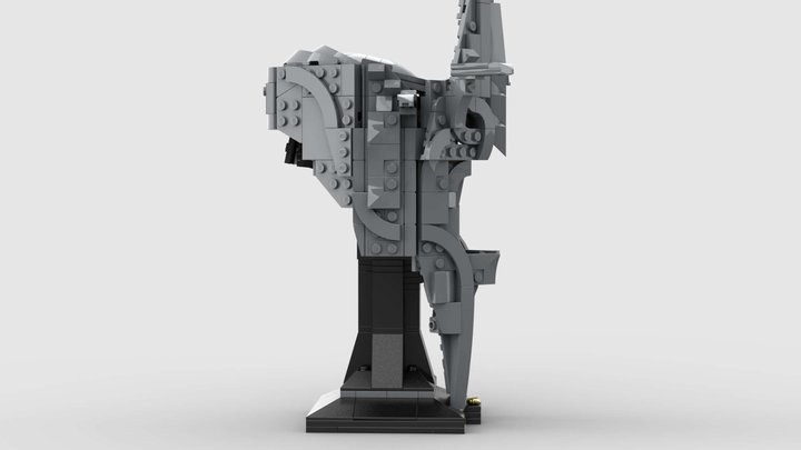 There is no visible face beneath the helmet. It opens below the eye holes into two long downward curving prongs that function almost like iron fangs, giving the impression of a twisted metal skull. Wedge plates and curved slopes create a recessed void, an empty gaze that suggests no physical features beneath, only darkness. I had to raise the display stand slightly to accommodate the length of the downward prongs.