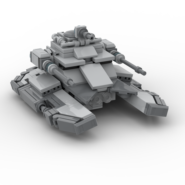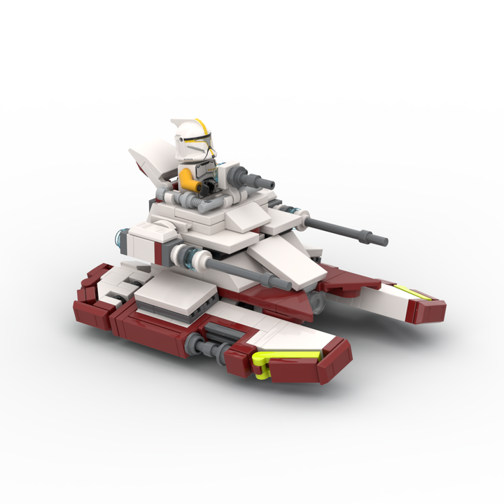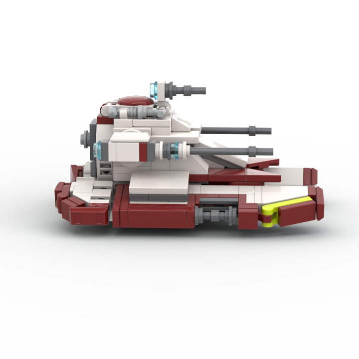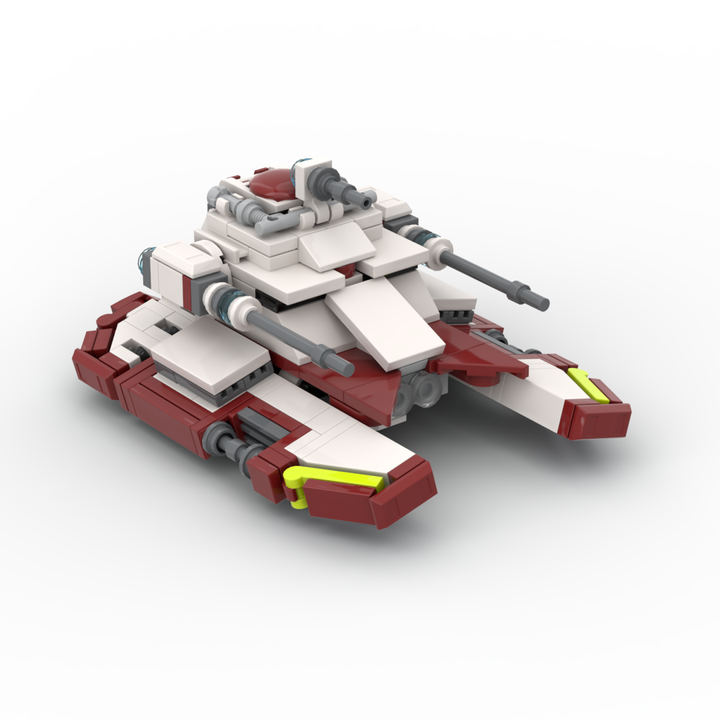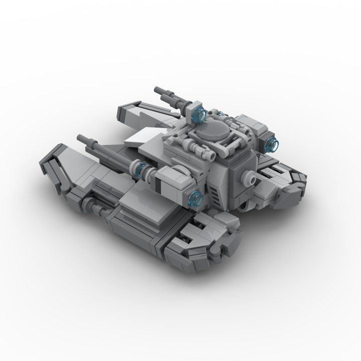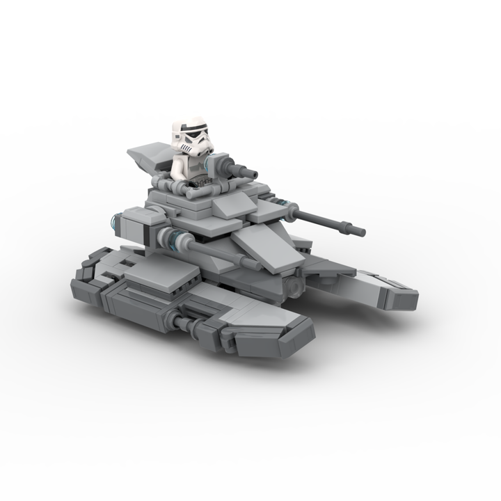 This is a unique rendition of the TX130 Tank with colors from both the Republic and Imperial Eras. At 1/73th scale, this poses more as a Chibi model than something minifigure scale, however it still has the ability to hold a minifigure out the top and comes with some unique features that are accurate and fun to put together. This build has some advanced techniques but nothing illegal; the odd number base is one of my favorite techniques but this also uses snot and bar connections for perfecting the details. This is also based on the version from Battlefront so there are some parts like the blue glow on the laser cannons and pose able swaying of the back fins.