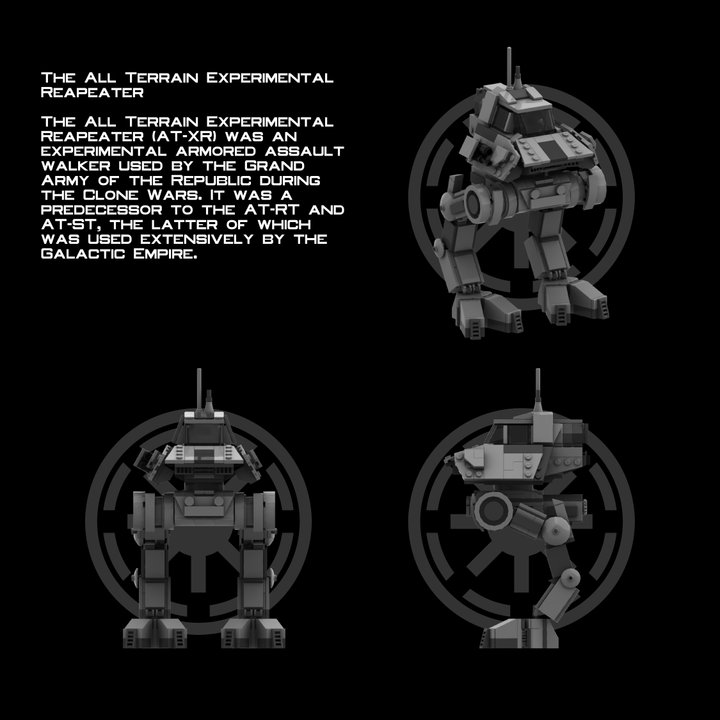 The All Terrain Experimental Reapeater (AT-XR) was an experimental armored assault walker used by the Grand Army of the Republic during the Clone Wars. It was a predecessor to the AT-RT and AT-ST, the latter of which was used extensively by the Galactic Empire.