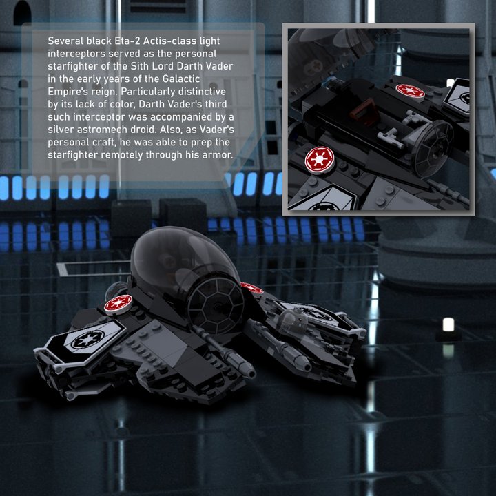 Several black Eta-2 Actis-class light interceptors served as the personal starfighter of the Sith Lord Darth Vader in the early years of the Galactic Empire’s reign. Particularly distinctive by its lack of color, Darth Vader’s third such interceptor was accompanied by a silver astromech droid. Also, as Vader’s personal craft, he was able to prep the starfighter remotely through his armor.