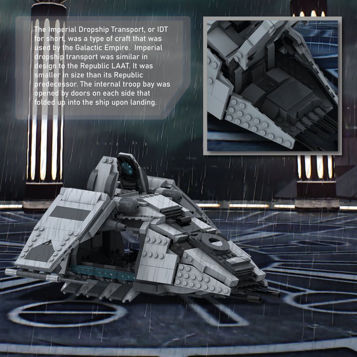 Much like the MAAT gunship and RaDAir speeder, the Imperial dropship transport was similar in design to the Republic LAAT. The dropship transport was smaller in size than its Republic predecessor. Its cockpit was elongated in a similar vein to that of the Lambda-class T-4a shuttle. The internal troop bay was opened by doors on each side that folded up into the ship upon landing. It possessed two large wings, like the LAAT, and two smaller wings on the top.