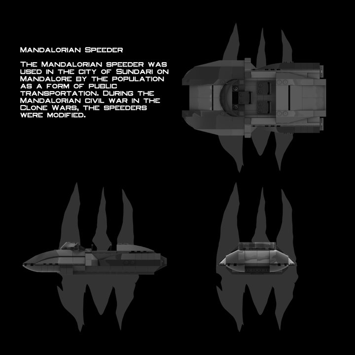 The Mandalorian’s Speeders was used in the city of Sundari on Mandalore by the population as a form of public transportation. During the Mandalorian civil war in the Clone Wars, the speeders were modified.
