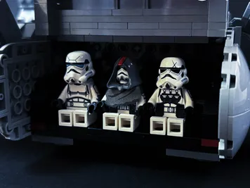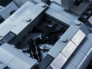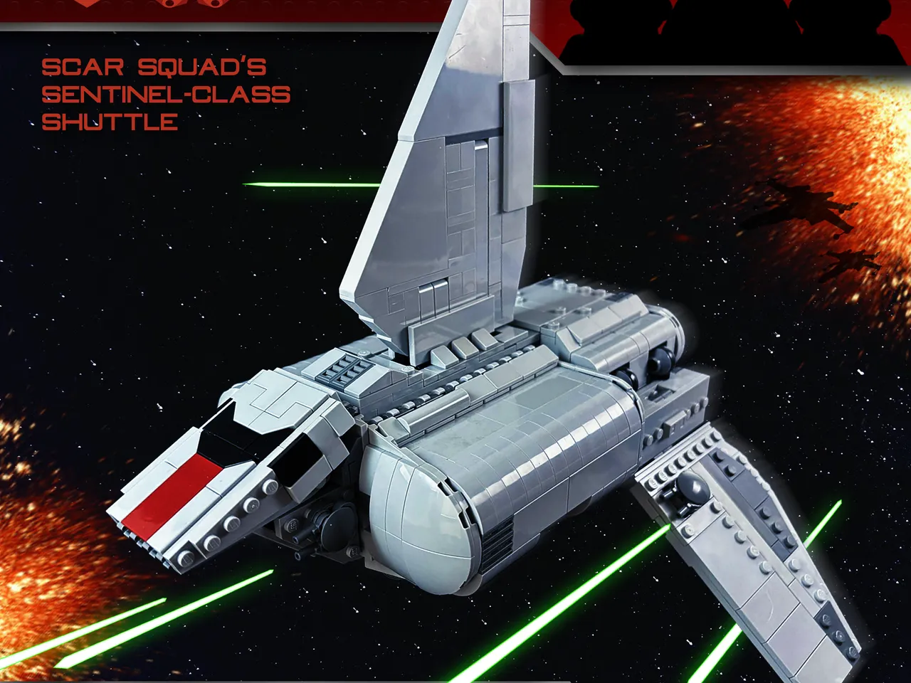 This model comes with movable wings, an interior spacious enough to fit up to 7 figurines including the pilot, and a rear loading bay perfect for storing all your accessories. There is also possibilty to change this MOC into regular Sentinel-Class Shuttle by changing the front tile from DK Red to LBG (brick is not included in XML file).