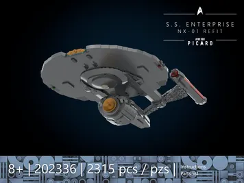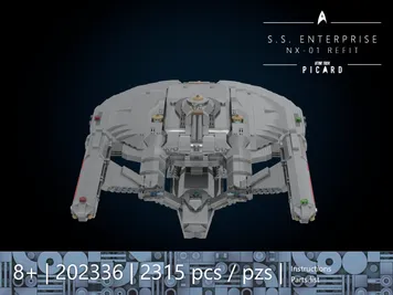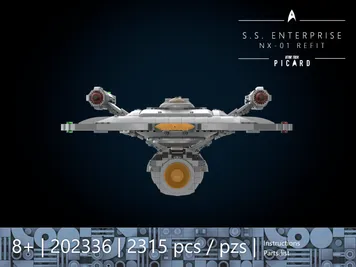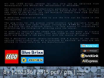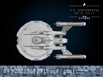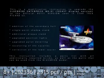 This is a conversion instruction for the BLUEBRIXX 105437 Enterprise NX-01 Display Version. The base model is required. The guide describes the exact conversion process as well as the extension of the secondary hull. All additional parts required are listed in the parts list with their corresponding ID numbers. Since LEGO itself offers very few parts in Flat Silver, the majority of the parts needed for the conversion come from GoBricks (source of supply is listed in the instructions). The 3 deflector pieces (brass-colored) and four secondary hull pieces (Flat Silver) are not available from any brick brand and must therefore be airbrushed or painted.