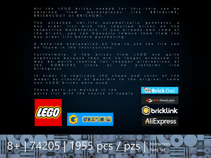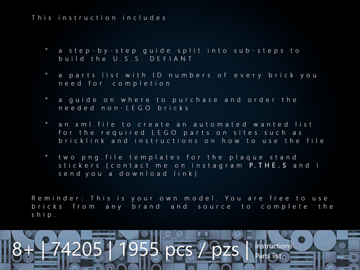 The instruction includes a step-by-step guide to build the ship and the shadow stand. The small chaffee-shuttle from the show is also includedand can be displayed on the shadow stand or docked into the Defiant shuttle bay. The instruction comes with a complete parts list and a xml. file for all the required LEGO bricks. All non-LEGO bricks (~2% of the design) are marked in the parts list with the source of supply.