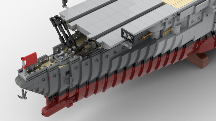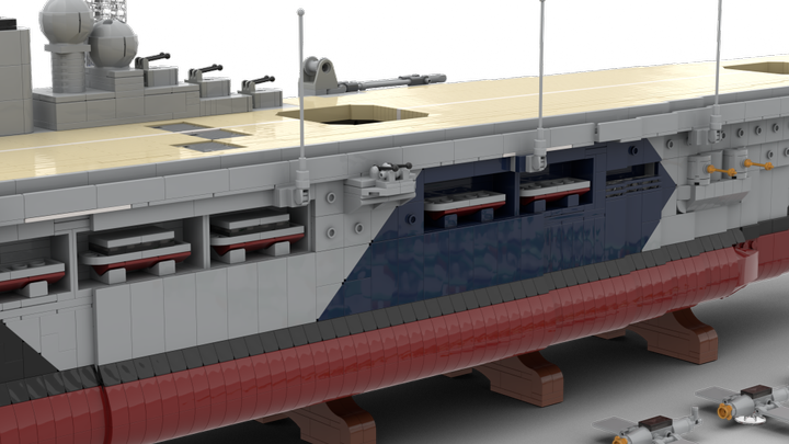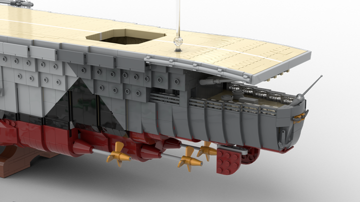This model strictly follows a 1:200 scale and closely adheres to the original. All three aircraft elevators are functional, and there is an aircraft carousel at the stern.
