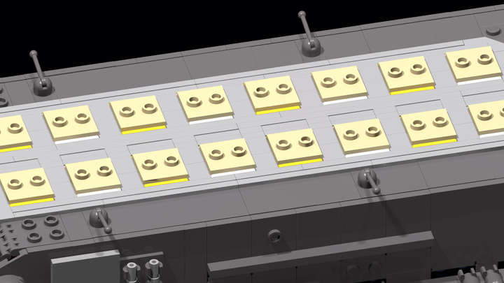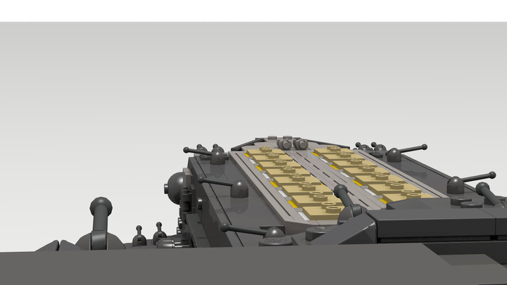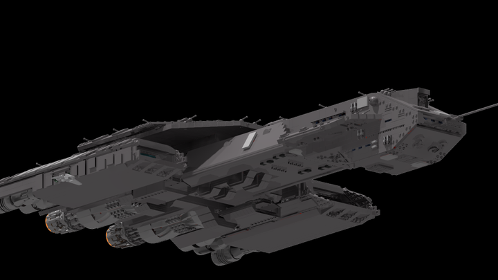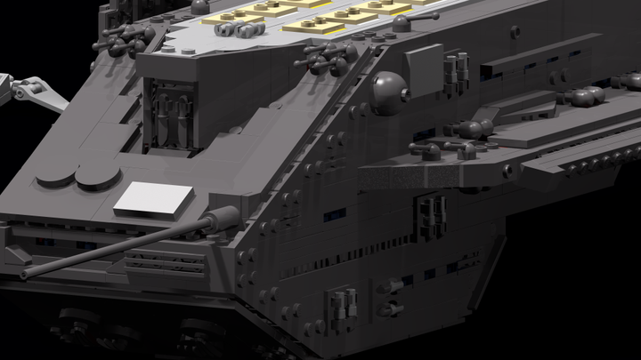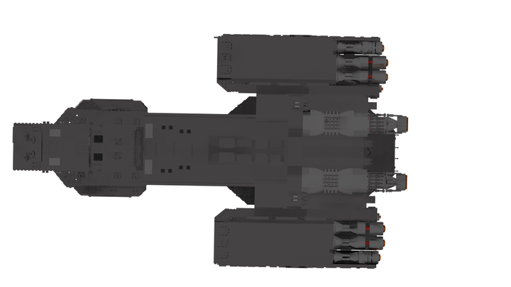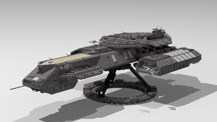 This display-model has a lenght around 80 cm and contains over 9000 parts in a lot of unusual building techniques to be really detailed. It has 32 little railgun turrents and 10 space engines on the stern. Its possible to carry 12 F-302-fighters in the two hangar bays on the right and the left side. Eight big shock absorbers are montated on the hangar bays and on the head you can see some little windows. On the big, detailed turtle armor sits the little commando bridge. The model has a big milkywaygate as baseplate for the presentation stand.