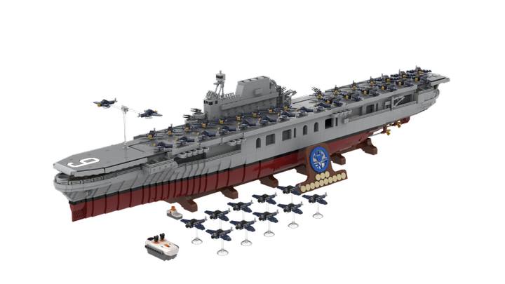 This model of the ship shows it in the construction state during the battle of Midway and contains nearly 10.000 parts. Is is possible to move all the elevator lifts and the plane carusell on the flight deck electrically.
