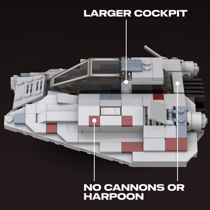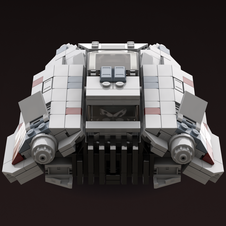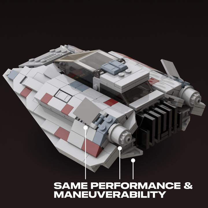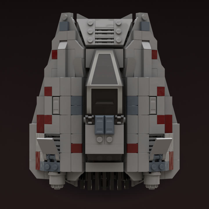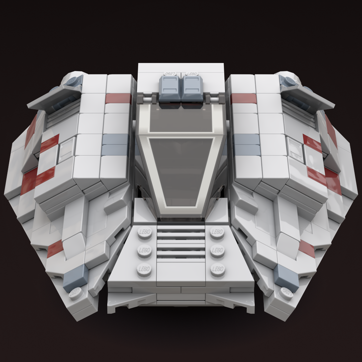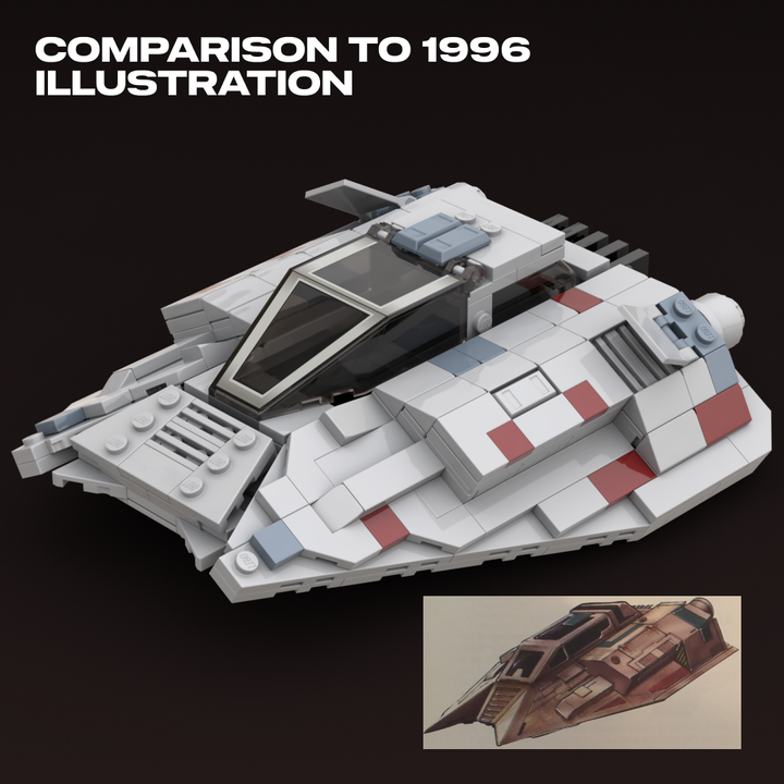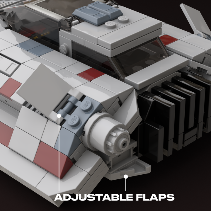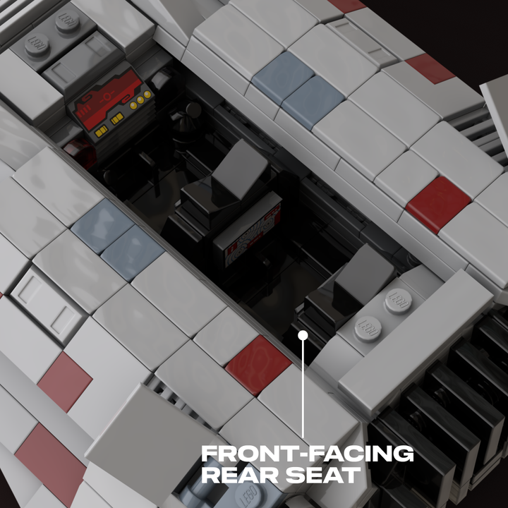 This MOC is closely based on a 1996 concept illustration, which shares the same wedge-shaped silhouette but features larger repulsorlift housings and no weaponry. Like my other T-47 builds, it includes detailed rear cooling fins and four poseable air brake flaps. The cockpit interior features a pilot seat with flight controls and a forward-facing rear seat for a passenger.