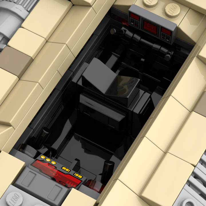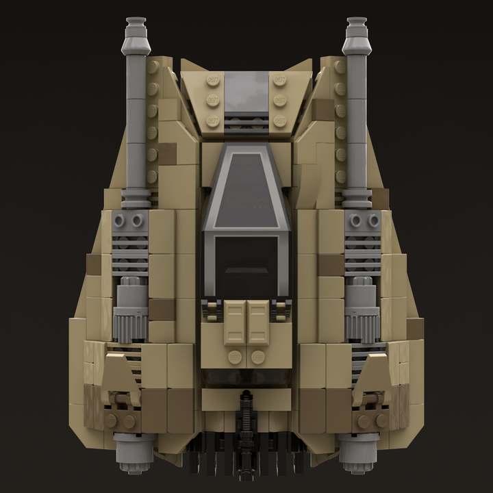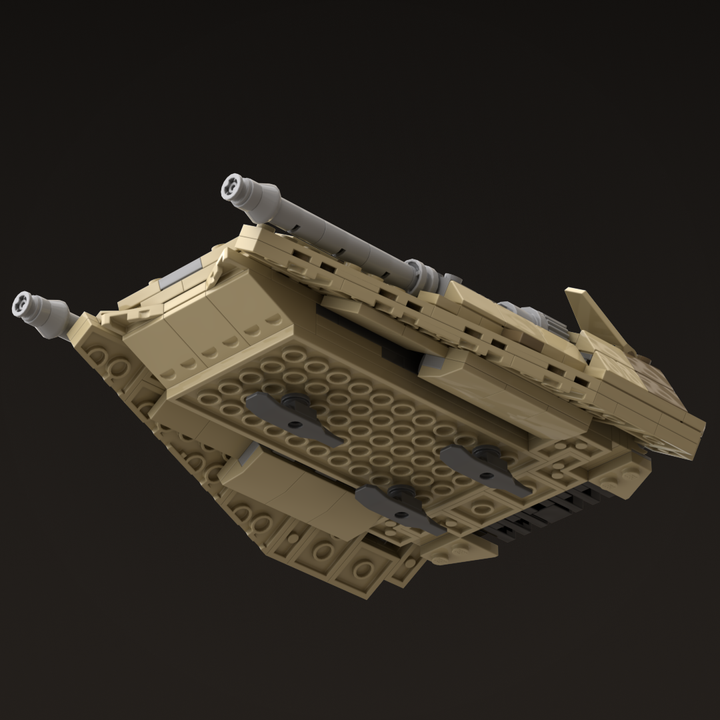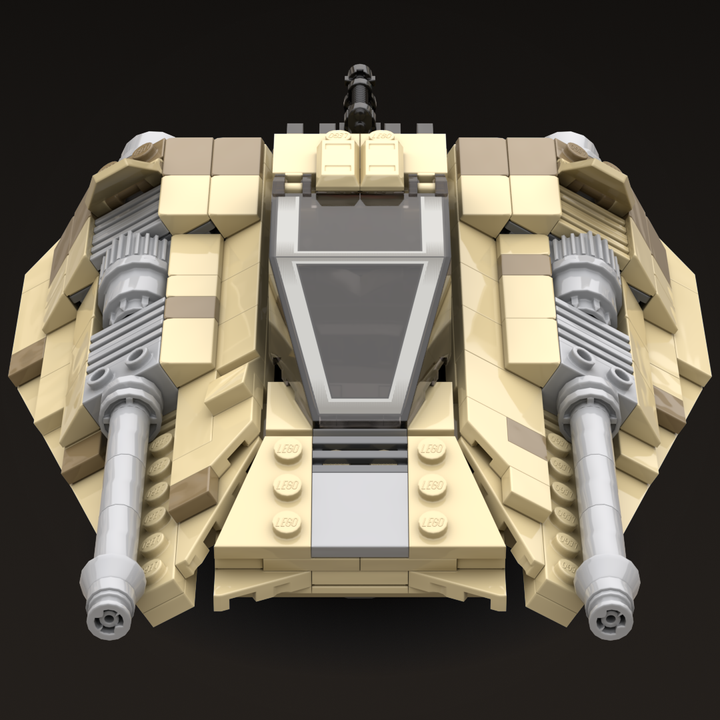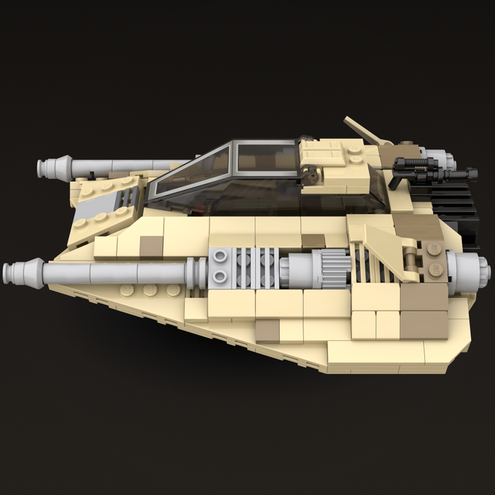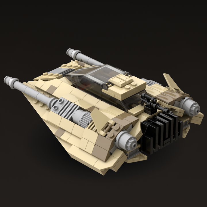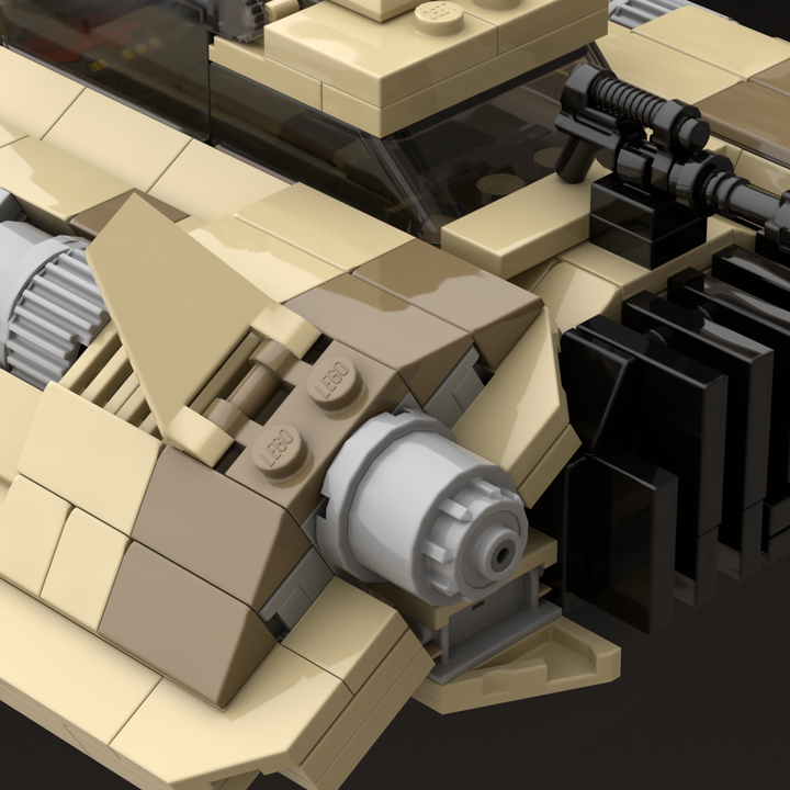 This MOC models the distinctive wedge-shaped form in tan and dark tan and includes four poseable air brake flaps for flight or landing positions, along with detailed rear cooling fins. The repulsorlift housings and laser cannons are more sealed than those on the Snowspeeder to better protect them from sand and debris. Following established lore, the rear harpoon has been replaced with a light repeating blaster cannon better suited to desert combat.